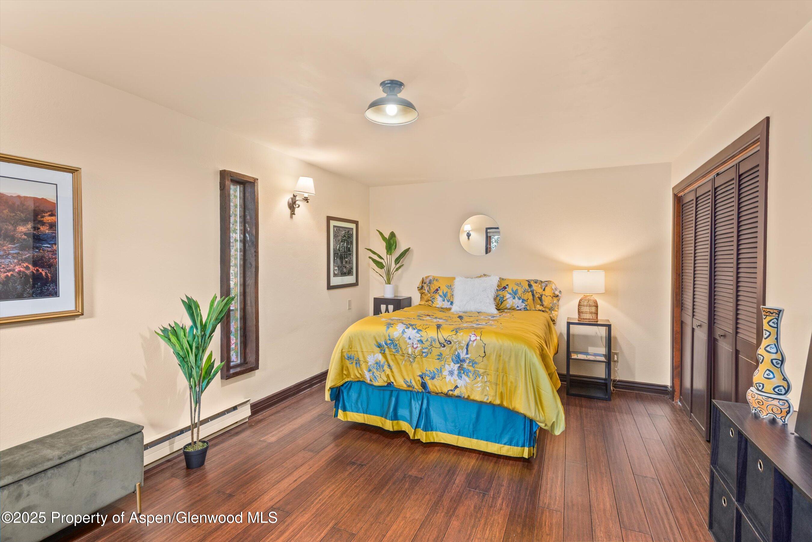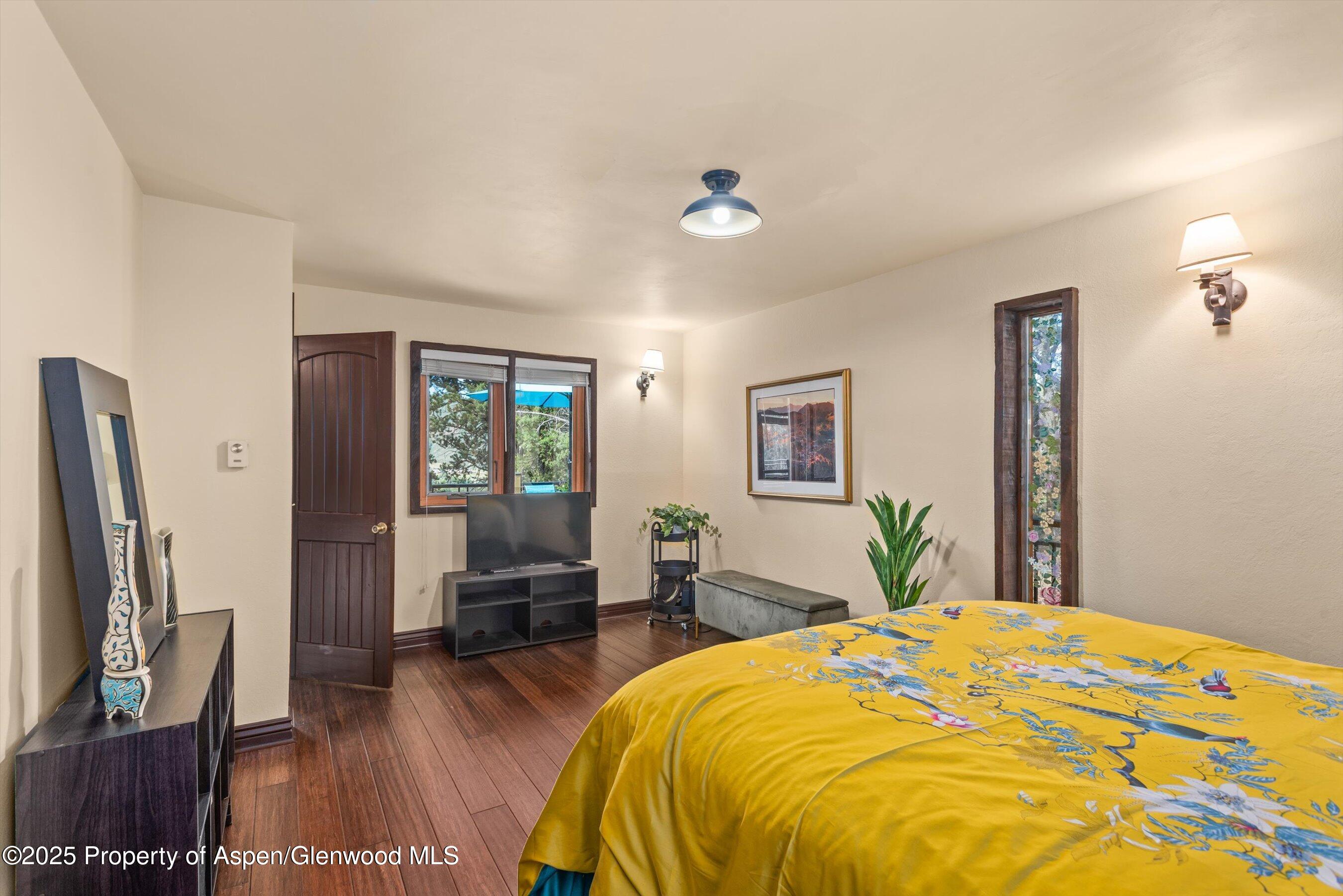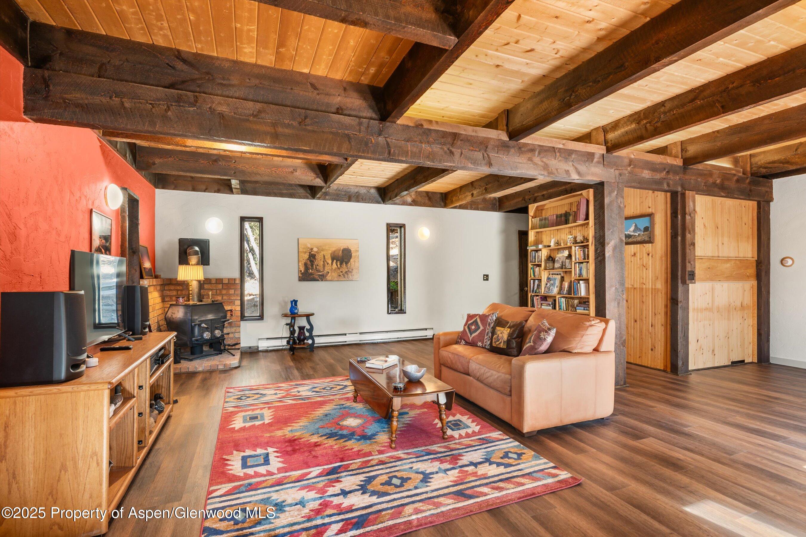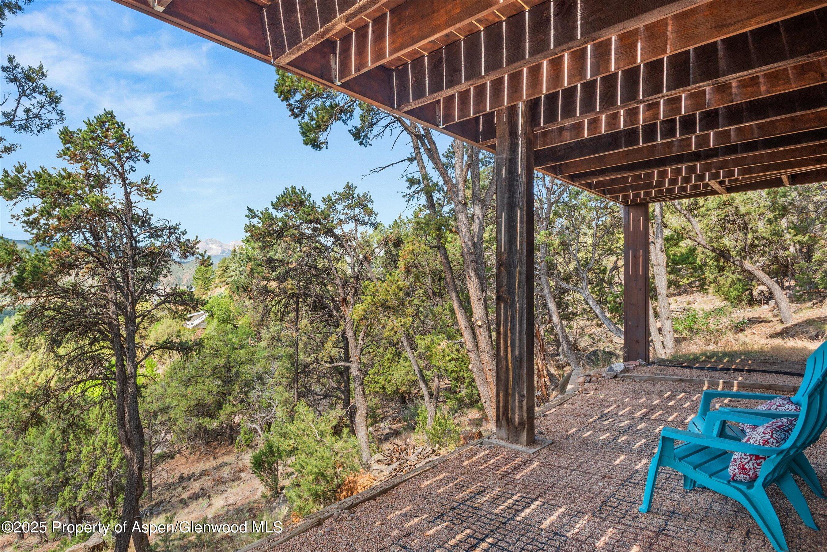 Downstairs, a cozy lounge with another wood stove opens to a large studio space with ample storage, new flooring, and laundry area. A fourth bedroom and a beautifully remodeled bath with walk-in shower round out the lower level. The property includes evolving gardens that bloom from spring to late summer, a fenced yard with arbors, a whimsical historic and year round usable Quonset hut, and a three-car garage with workshop space and ample storage for toys to compliment the Colorado lifestyle. Surrounded by forest and wildlife yet close to trails and town, this private mountain retreat offers character, history, and unmatched versatility -- a true Basalt gem.