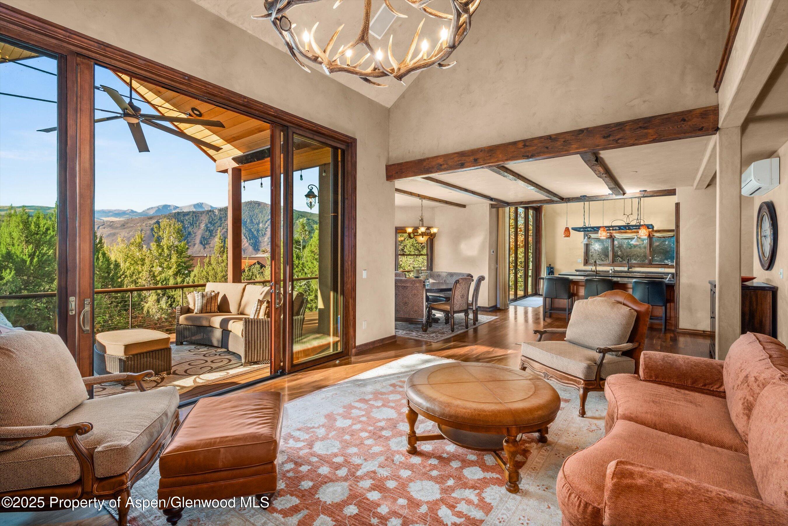 This private sanctuary combines elegance, privacy, and panoramic views yet minutes from downtown Basalt, Willits/Whole Foods and the Roaring Fork Club. Perched atop the prestigious Aspen Junction subdivision and surrounded by hundreds of acres of BLM Land, this stunning Colorado mountain home also offers abundant outdoor living spaces complete with sunken hot tub and built-in fireplace. Step into the dramatic two-story living room featuring floor-to-ceiling windows that flood the space with natural light and frame breathtaking views of Mt. Sopris and Elk Mountains. Rich walnut flooring, quality finishes and a cozy den just off the main living area add warmth and character. The open layout and direct access to the covered decks from the living room and gourmet kitchen promote open yet intimate entertaining spaces.